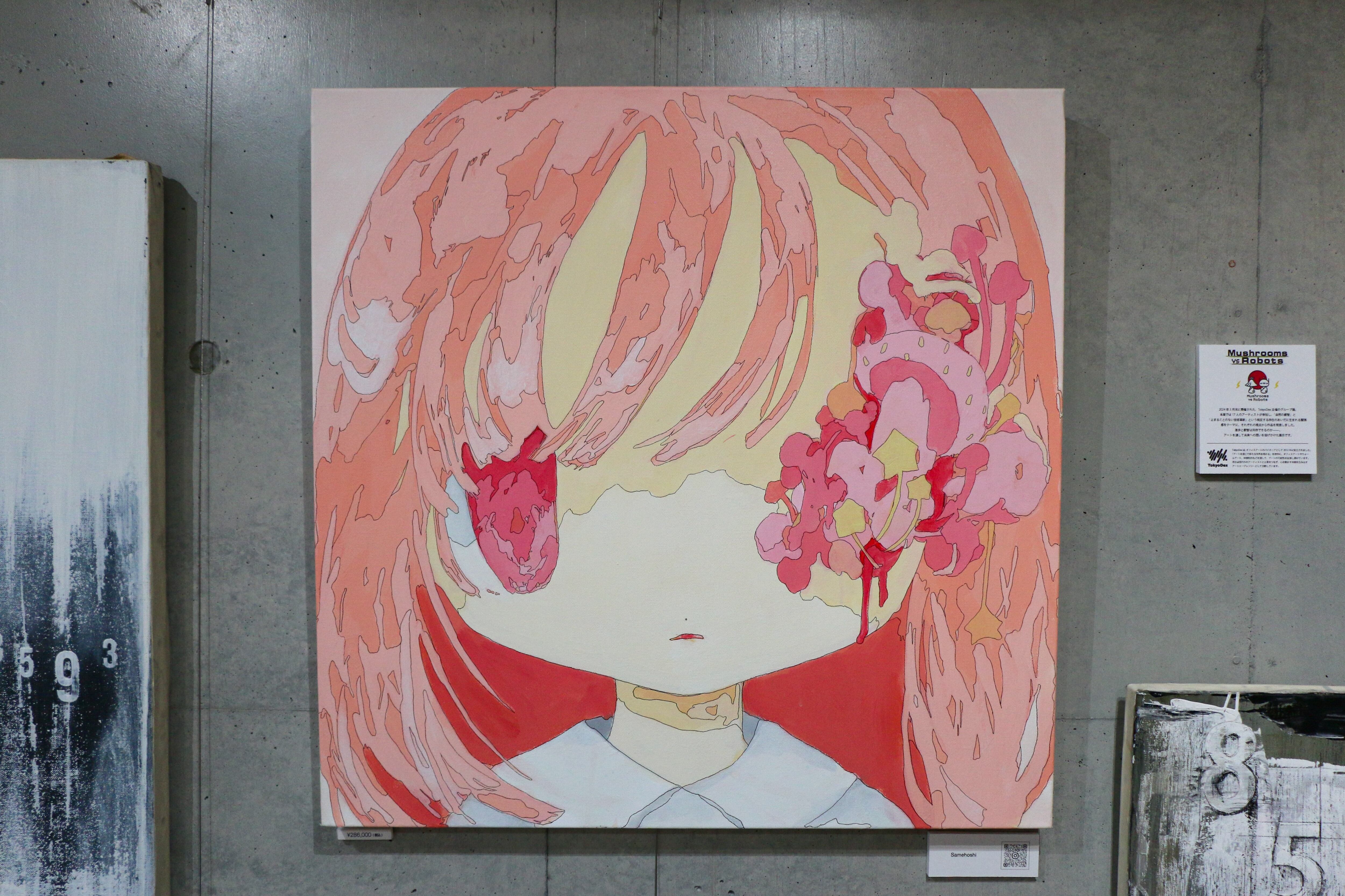 ひとつ目は、Mushrooms VS Robots という展覧会のテーマを聞いた時に真っ先に思いついた作品です。あたたかく湿った場所に胞子があれば繁殖ができるキノコ。その圧倒的な生命力を描きました。